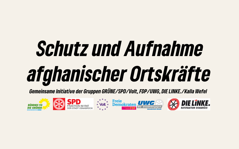 GRÜNE, SPD, FDP, LINKE und Volt im Osnabrücker Rat appellieren an die Bundesregierung, ihrer Zusage nachzukommen und die aktuell in Pakistan von Abschiebungen bedrohten mehr als 2.000 afghanischen Ortskräfte, Kulturschaffenden und Menschenrechtsaktivist:innen schnellstmöglich nach Deutschland zu holen.