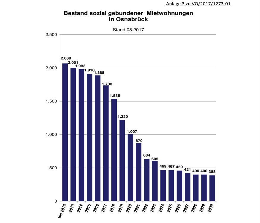 Angesichts von über 17.000 Haushalten in Osnabrück mit wenig Einkommen, ist die Entwicklung des Angebots von gebundenem Wohnraum (also mit Mietpreisbindung) von besonderer Bedeutung. Das Angebot an gebundenem Wohnraum wird in 2020 jedoch auf nur noch rund 1.000 Wohnungen sinken. Von daher besteht insbesondere in diesem Segment wohnungspolitisch besonderer Handlungsbedarf.