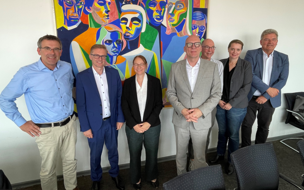 Foto: Vertreter:innen aus Stadt und Landkreis Osnabrück in Hannover, von links nach rechts: Martin Büker, Frank Henning, Kerstin Schlüter (Leiterin des Fachbereichs Kinder, Jugendliche und Familien, Stadt Osnabrück), Wolfgang Beckermann (Erster Stadtrat; Vorstand für Bildung, Kultur und Familie, Stadt Osnabrück), Wolfgang Ruthemeier (Leiter des Fachdienstes Familie - Sozialer Dienst, Stadt Osnabrück), Ines Kolmorgen (Fachdienst Jugend, Landkreis Osnabrück), Matthias Selle (Kreisrat für Bildung, Jugend und Soziales, Landkreis Osnabrück)