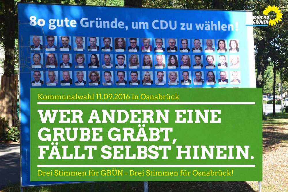 Im Wahlprogramm, auf Plakaten, in Flyern und Anzeigen der CDU zur Kommunalwahl am Sonntag, 11.09.2016, stehen mehrere falsche Behauptungen über GRÜNE Politik in Osnabrück. Damit ihr diese Behauptungen entlarven könnt, hier ein Faktencheck zu einigen zentralen Punkten: