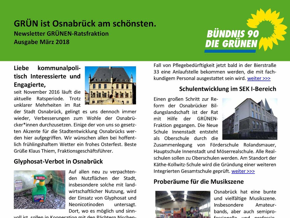 seit November 2016 läuft die aktuelle Ratsperiode. Trotz unklarer Mehrheiten im Rat der Stadt Osnabrück, gelingt es uns dennoch immer wieder, Verbesserungen zum Wohle der Osnabrücker*innen durchzusetzen. Einige der von uns so gesetzten Akzente für die Stadtentwicklung Osnabrücks werden hier aufgegriffen. Wir wünschen allen bei hoffentlich frühlingshaftem Wetter ein frohes Osterfest. Beste Grüße Klaus Thiem, Fraktionsgeschäftsführer.
