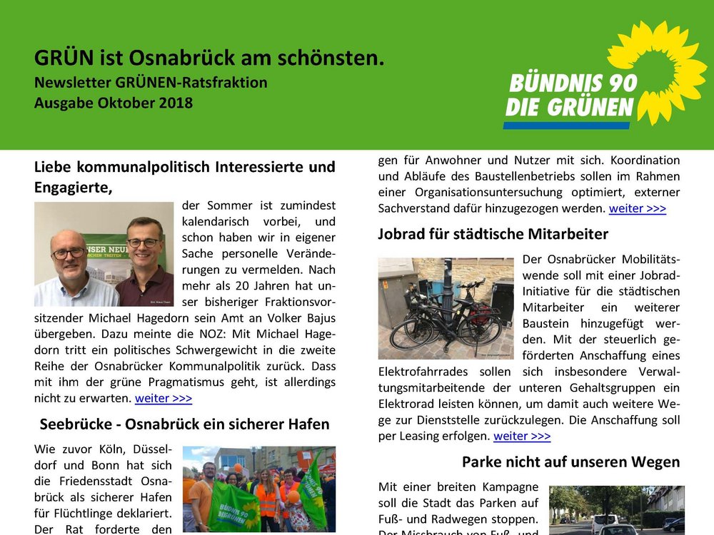 der Sommer ist zumindest kalendarisch vorbei, und schon haben wir in eigener Sache personelle Veränderungen zu vermelden. Nach mehr als 20 Jahren hat unser bisheriger Fraktionsvorsitzender Michael Hagedorn sein Amt an Volker Bajus übergeben. Dazu meinte die NOZ: Mit Michael Hagedorn tritt ein politisches Schwergewicht in die zweite Reihe der Osnabrücker Kommunalpolitik zurück. Dass mit ihm der grüne Pragmatismus geht, ist allerdings nicht zu erwarten. weiter >>>