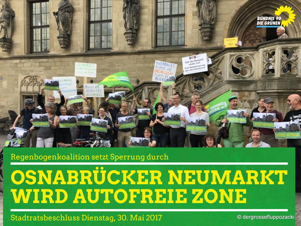 Der Rat hat am Dienstagabend mit der Mehrheit der Regenbogenkoalition beschlossen, den motorisierten Individualverkehr vom Neumarkt zu verbannen. Bereits vor der Sitzung feierten zahlreiche Anhänger der Osnabrücker GRÜNEN das Neumarktvotum vor dem Rathaus. „Nach langer Zeit der Auseinandersetzungen ist heute ein Tag sich zu freuen“, stellte der stadtentwicklungspolitische Sprecher der GRÜNEN-Ratsfraktion, Volker Bajus, fest.