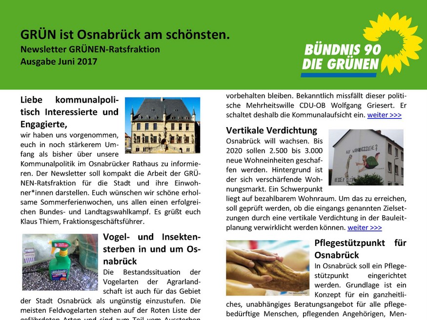 wir haben uns vorgenommen, euch in noch stärkerem Umfang als bisher, über unsere Kommunalpolitik im Osnabrücker Rathaus zu informieren. Der Newsletter soll kompakt die Arbeit der GRÜNEN-Ratsfraktion für die Stadt und ihre Einwohner*innen darstellen. Euch wünschen wir schöne erholsame Sommerferienwochen, uns allen einen erfolgreichen Bundes- und Landtagswahlkampf.