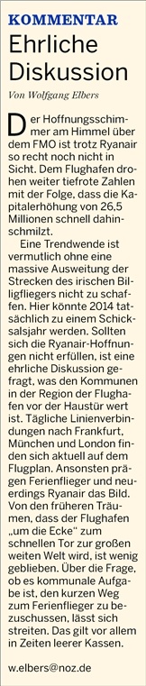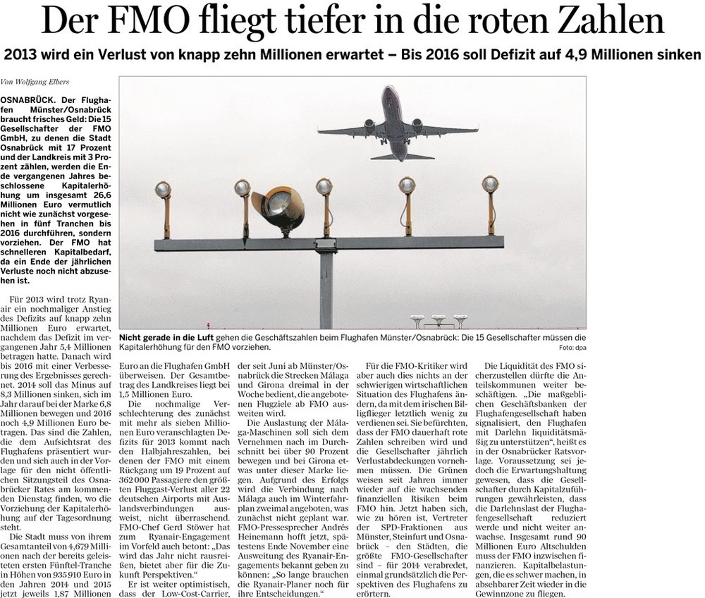 Der Flughafen Münster/Osnabrück braucht frisches Geld: Die 15 Gesellschafter der FMO GmbH, zu denen die Stadt Osnabrück mit 17 Prozent und der Landkreis mit 3 Prozent zählen, werden die Ende vergangenen Jahres beschlossene Kapitalerhöhung um insgesamt 26,6 Millionen Euro nicht wie zunächst vorgesehen in fünf Tranchen bis 2016 durchführen, sondern vorziehen. Der FMO hat schnelleren Kapitalbedarf, da ein Ende der jährlichen Verluste noch nicht abzusehen ist.