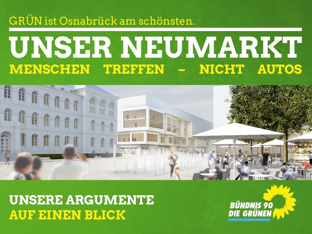 Die Ratsfraktion der Osnabrücker GRÜNEN präsentiert ab sofort ihre Vorstellungen für einen vom Autoverkehr befreiten Neumarkt auf einer eigens dafür eingerichteten Internet-Seite. „Das GRÜNE Konzept für einen autofreien Neumarkt findet sich unter der Internet-Adresse: neumarkt.fraktion-gruene-os.de. Wir informieren damit in zeitgemäßer Form die Öffentlichkeit über unsere Argumente und die Vorteile eines autofreien Neumarkts“, erklären der Fraktionsvorsitzende, Michael Hagedorn, und der stadtentwicklungspolitische Sprecher, Jens Meier.